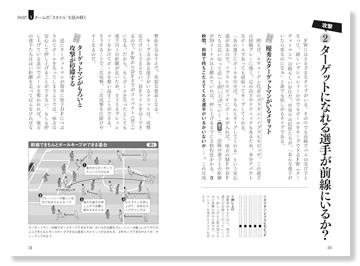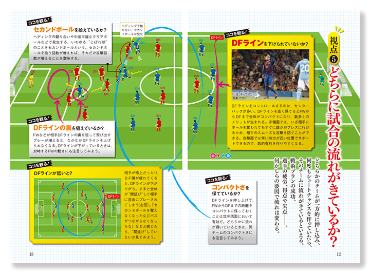 サッカー観戦をより深く理解するための解説書で、細かなイラストを用いた図解が多く、限られた版型の中で情報量と読みやすさのバランスを取るレイアウト設計を重視しました。
